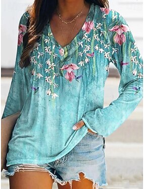 Женская футболка с V-образным вырезом длинным рукавом туника цветочный график растения винтажный стильный классический регулярный топ повседневный принт розовый синий зеленый лето весна осень