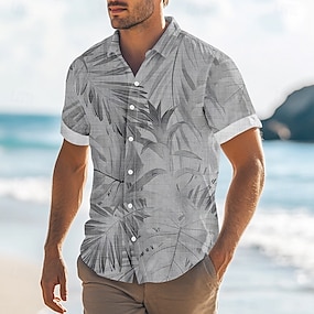 Муж. Лист Тропические растения Гавайская рубашка Рубашка Алоха С короткими рукавами Гавайский Прибегнуть Отпуск Праздники Одежда для пляжа Лето Весна Отложной Кнопка вверх Серый