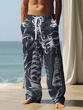 Муж. Летние штаны Эластичная талия дерево Кокосовая пальма Комфорт Полная длина на открытом воздухе Уличная одежда Отпуск Гавайский Белый Синий Слабоэластичная