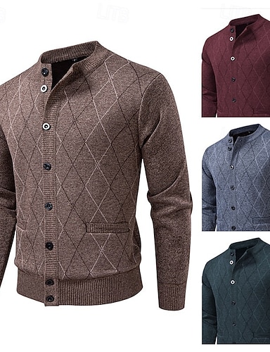 Муж. Вязаная ткань Кардиган Рельефный узор Вязать Обычные топы Трикотаж Полотняное плетение Вырез под горло Отпуск Мода Повседневные На каждый день Одежда Осень Весна & осень Бордовый Темно синий M L