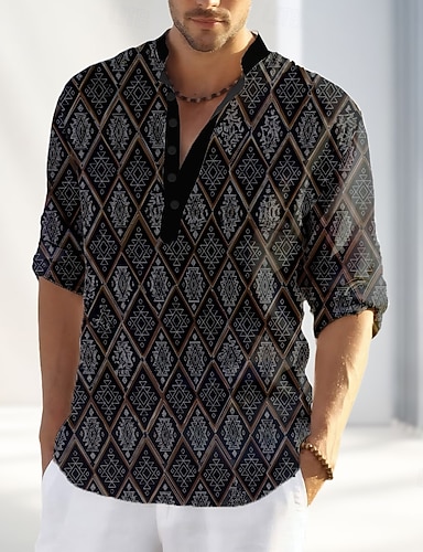 Муж. Геометрический принт Этнический Футболка Рубашка Хенли Длинный рукав Оригинальный рисунок Ретро Этнический Для улицы Повседневные Лето Весна Осень Коричневый Зеленый Синий Хаки Хенли