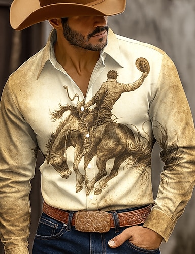 Муж. Скачки Рубашка Кнопка рубашка Ковбойская рубашка Длинный рукав западный стиль на открытом воздухе Отдых и туризм Для охоты Весна Осень Отложной 3D печать рубашки с воротником Белый Хаки