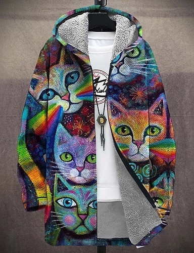 Муж. Животное Кот Зимнее пальто Флисовая жилетка Пальто Сохраняет тепло Удобный На каждый день На каждый день Молния Карман 3D печать Осень Зима Капюшон Длинный рукав Черный Цвет радуги