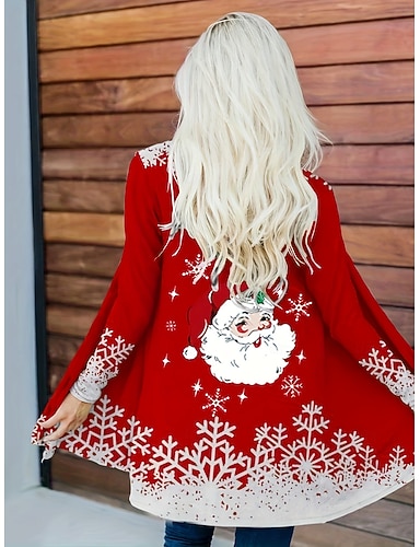 Жен. Зимнее пальто Легкость Удобный С принтом Открытый перед Винтаж Мода На каждый день Дед Мороз Отпуск Повседневные Длинная Без воротника Стандартный Длинный рукав Верхняя одежда Красный Весна Осень