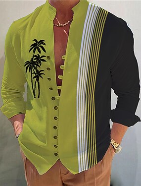 Муж. Кокосовая пальма Полоски Тропические растения Рубашка Гавайская рубашка Рубашка Алоха Длинный рукав Рубашка Воротник-стойка Мода Уличный стиль Оригинальный рисунок
