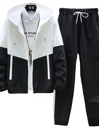 Муж. Спортивный костюм из двух частей Толстовка с капюшоном для отдыха Комплекты спортивных костюмов Застегнуться Контрастных цветов Наборы одежды Весна Черный Синий Тренажерный зал Разрабатывать Бег