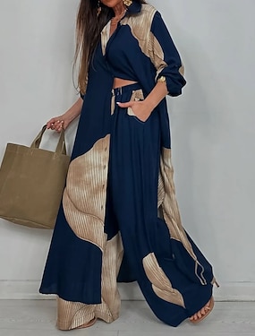 Жен. Элегантный стиль Богемия Отпуск Рубашка Комплекты брюк Длинный рукав Рубашечный воротник Графика Пэчворк на открытом воздухе Отпуск Для вечеринок Цвет бордо Темно-синий Синий Лето