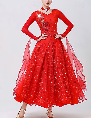 Бальные танцы Платье Стразы Вышивка Жен. Выступление Учебный Длинный рукав Спандекс Органза