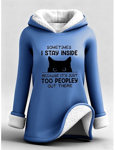 Жен. Толстовка с капюшоном и пуловером Графика Кот Буквы На каждый день Комфорт Длинный рукав Капюшон Длинные топы Для улицы На каждый день Повседневные С принтом Розовый Синий Серый Осень Зима