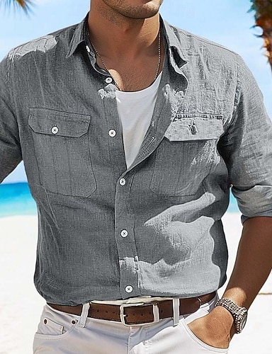 Муж. Рубашка Льняная рубашка Летняя рубашка Кнопка рубашка Рубашка-карго Полотняное плетение Повседневные Пляж Черный Белый Синий Цвет хаки Длинный рукав Воротничок Лето Весна лето Одежда Карман