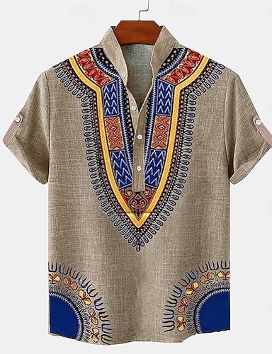 Муж. льняная рубашка Рубашка Хенли ретро рубашки Винтажная рубашка Этническая рубашка Отпуск Повседневные Зеленый Хаки Бежевый С короткими рукавами Китайский воротник-стойка Лето Весна Одежда 3D