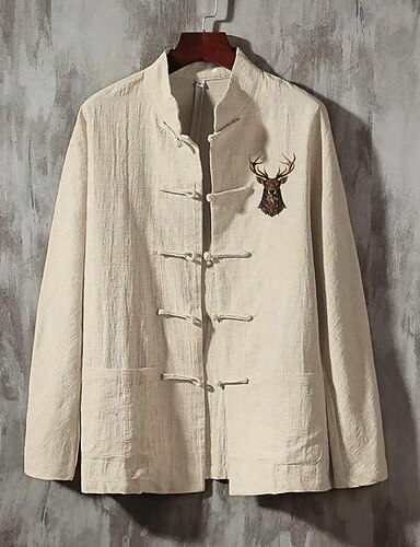 Муж. льняная рубашка Повседневная рубашка Кнопка рубашка Северный олень Отпуск Для улицы Черный Белый Темно-синий Бежевый Длинный рукав Воротник-стойка Весна лето Одежда Карман