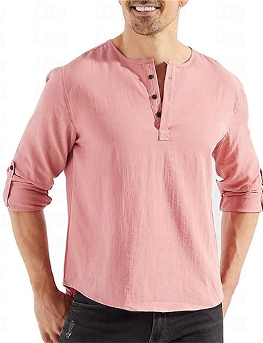 Муж. Рубашка льняная рубашка Рубашка с китайским воротником Рубашка с воротником-стойкой Летняя рубашка Пляжная рубашка Полотняное плетение Отпуск Для улицы Черный Белый Желтый Розовый Длинный рукав
