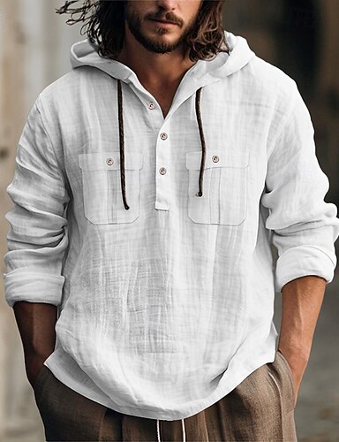 Муж. Рубашка Льняная рубашка Летняя рубашка Пляжная рубашка рубашка с капюшоном Полотняное плетение Повседневные Гавайский Черный Белый Синий Коричневый Длинный рукав Капюшон Весна лето Одежда