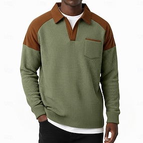 Муж. Вафельный тройник Длинный рукав V-образный вырез Лацкан Осень Весна & осень Наступила зима Сплошной цвет Мода Классический На каждый день Цветовые блоки Для улицы Повседневные Спорт