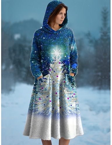 Новогодняя тематика Жен. Платье средней длины Платье A-силуэта На каждый день Для вечеринок Повседневные Стандартный Графика Новогодняя ёлка Длинный рукав Капюшон Черный Розовый Синий Осень Зима