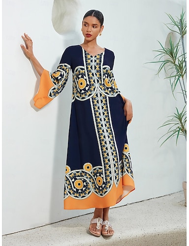 Жен. длинное платье платье макси Повседневное платье Летнее платье Платье в стиле бохо Стиль На каждый день Отпуск Повседневные Свидание Стандартный Геометрический принт Рукав 3/4 Вырез под горло