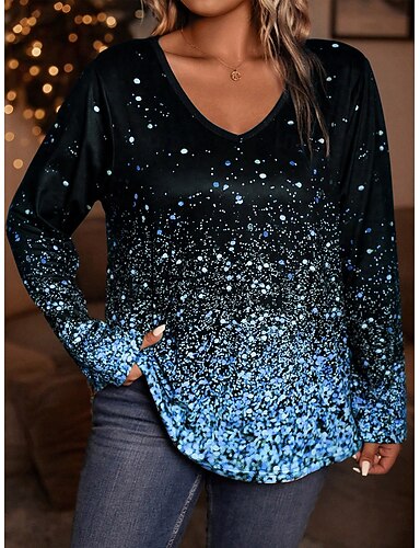 Жен. Большие размеры Верхушки Футболка Омбре С принтом Длинный рукав V-образный вырез На каждый день Повседневные Полиэстер Осень Зима Розовый Синий