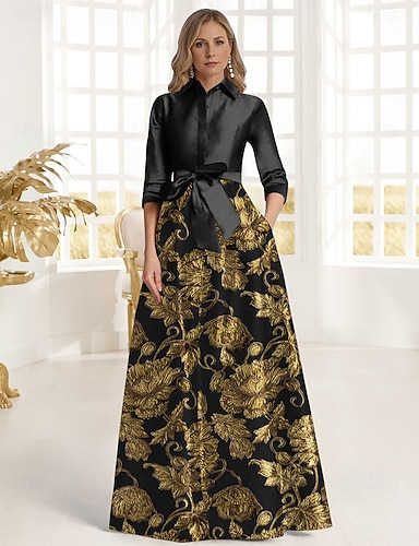 Черно-золотой цветочный жаккард Платье-елочка для матери невесты Элегантное С воротником-рубашкой Длиной до пола Таффета 3/4 рукав с бантом(а)