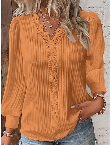 Жен. Кружевная рубашка Сплошной цвет Элегантный стиль Стиль Классический Длинный рукав V-образный вырез Обычные топы Повседневные Кружева Пэчворк Белый Красный Лиловый Оранжевый Зеленый