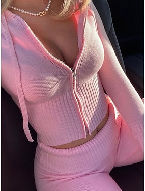Жен. Мода Уличный стиль Комплекты брюк Болеро Топ Длинный рукав Капюшон Сплошной цвет Молния на открытом воздухе Офис Повседневные Розовый Синий Коричневый Весна Стандартный