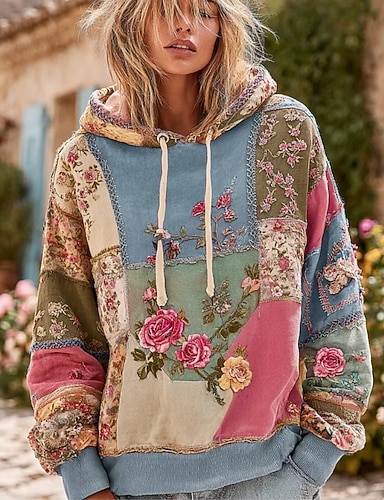 Женская 3D печать винтажного бохо худи патчворк худи свитшот цветочный пуловер свитшот оверсайз с длинными рукавами повседневный теплый активный капюшон стритстайл ежедневная носка патчворк
