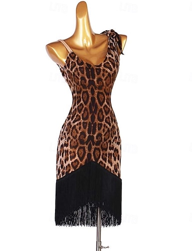 Женское платье для латиноамериканских танцев с леопардовым принтом, бахромой по низу, регулируемым ремешком и сексуальными завязками на плечах — идеально подходит для сальсы, румбы и выступлений.