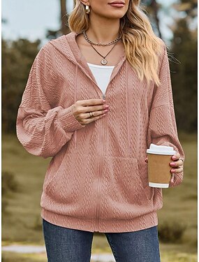 Жен. Текстурная толстовка Выходя на вершины Сплошной цвет Полотняное плетение На каждый день Длинный рукав Фонарь рукавом V-образный вырез Длинные топы Повседневные Молния Карман