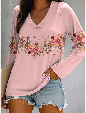 Футболка для женщин с длинным рукавом V-образный вырез длинный рукав графика повседневная цветочная растения элегантная винтажная стильная регулярные топы повседневная выходные принт белый розовый