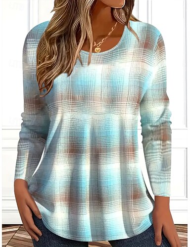 Жен. Футболка Графика В клетку Винтаж Стиль Классика Длинный рукав Вырез под горло Круглый вырез Обычные топы Повседневные С принтом Светло-синий Весна Осень Зима