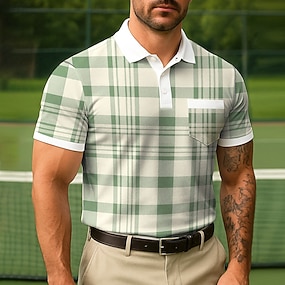 Муж. В клетку Поло С короткими рукавами Отложной Деловые На каждый день Для занятий спортом Одежда для спорта и отдыха На каждый день Карман Пуговицы Лето Белый Темно синий Зеленый