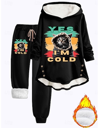 Жен. Элегантный стиль Теплый Мода Комплекты из двух предметов Спортивный костюм Комплекты брюк Длинный рукав Широкий, стянутый у запястья Вырез под горло Круглый вырез Графика Животное Кот С принтом