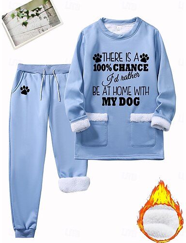 Женский комплект пижам с флисовой подкладкой элегантный теплый модный комплект из двух частей спортивные костюмы брюки наборы с длинным рукавом круглым вырезом графический текст принт для отдыха на