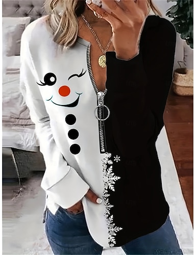 Жен. Пуловер Толстовка Толстовки с застежкой-молнией Графика Рождество Мода На каждый день Длинный рукав Вырез под горло Обычные топы Для улицы На каждый день Повседневные Молния С принтом Черный
