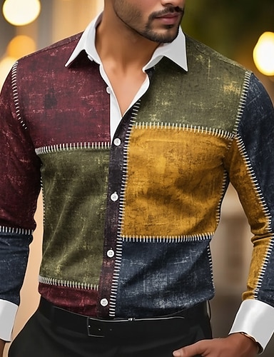 Муж. Геометрический принт Контрастных цветов Пэчворк Рубашка Атласная рубашка Длинный рукав Винтаж Ретро Отпуск На каждый день Лето Весна Осень Отложной 3D печать Рубашки на пуговицах