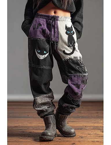 Женские брюки-кюлоты с принтом «кошка на Хэллоуин», широкие брюки для бега, винтажный этнический стиль, полная длина, высокая талия, завязка на завязках, лоскутный рисунок, быстросохнущие, дышащие,