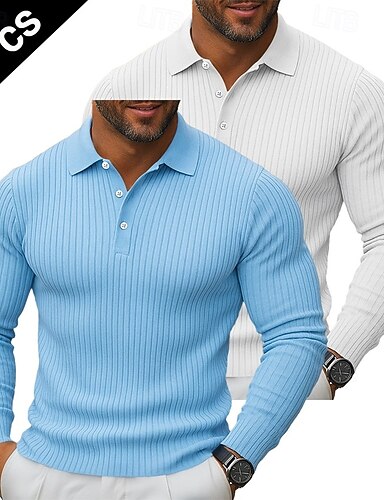 Муж. Вязаный топ в рубчик Рубашки-поло для гольфа Для улицы Повседневные Лацкан Длинный рукав Классический Современное Полотняное плетение 2 предм Пуговицы Весна Осень Все сезоны Приталенный крой