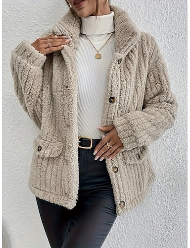 Жен. Зимнее пальто Куртка из шерпа Удобный Дышащий Карман Пуговицы На каждый день Полотняное плетение Отпуск Для улицы Повседневные На каждый день Однобортный крой Обычная Отложной Стандартный