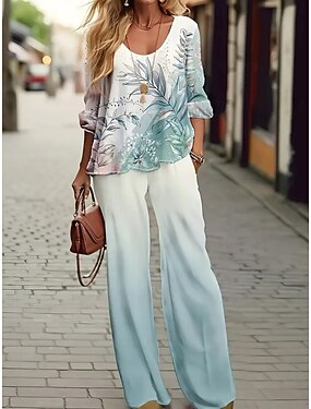 Жен. Богемия Отпуск Комплекты брюк Рукав 3/4 Вырез под горло Графика С принтом Отпуск Повседневные Праздники Хаки Лето Стандартный