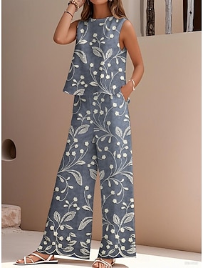 Женские 2-ух предметные наборы модной уличной одежды штаны без рукавов квадратный вырез цветочные графические принты для отдыха повседневные белый темно-синий королевский синий летние свободный покрой