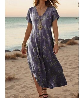 Жен. Длинное платье Повседневное платье Платье A-силуэта Стиль На каждый день Отпуск Повседневные Стандартный Цветочный принт Винтаж С короткими рукавами V-образный вырез