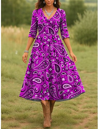 Жен. Платье средней длины Повседневное платье Платье A-силуэта Отпуск На каждый день Стандартный Графика Огурцы Рукав 3/4 V-образный вырез Красный Синий Лиловый Зеленый Весна Осень