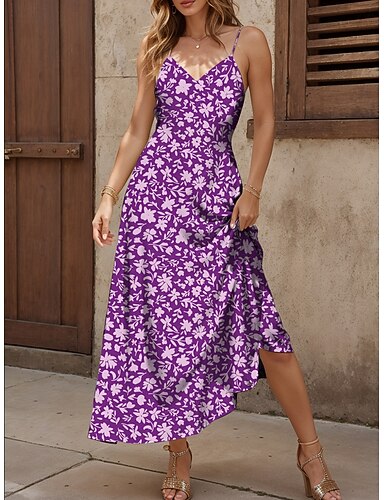 Жен. Длинное платье Платье A-силуэта Летнее платье Платье-комбинация Элегантный стиль Отпуск На каждый день Стандартный Цветочный принт Графика Без рукавов V-образный вырез На тонких бретелях