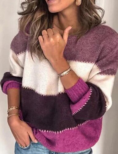 Жен. Вязаная ткань На каждый день Мягкий Полоски Рельефный узор Вырез под горло Пэчворк Трикотаж Длинный рукав Обычные топы Вязать на открытом воздухе Повседневные выходные Синий Лиловый Осень Зима