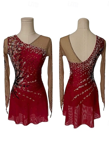 Платье для фигурного катания Жен. Девочки Катание на коньках Платья Красный Пэчворк Отверстие для большого пальца Сетка Спандекс Эластичность Учебный Соревнование Одежда для фигурного катания
