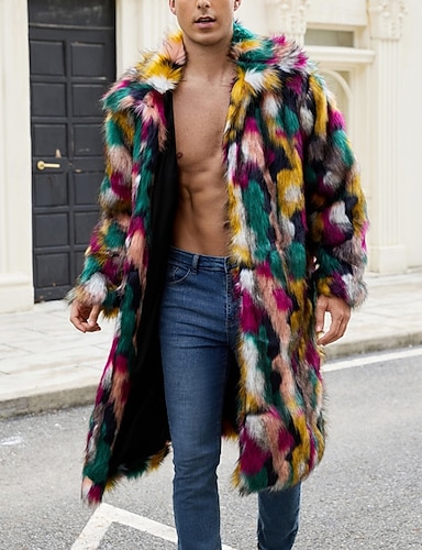 Муж. Повседневная куртка Искусственное меховое пальто Отпуск Повседневные Сохраняет тепло Плюш Осень Зима Радужный Мода Уличный стиль Лацкан Длинная Цвет радуги Жакеты