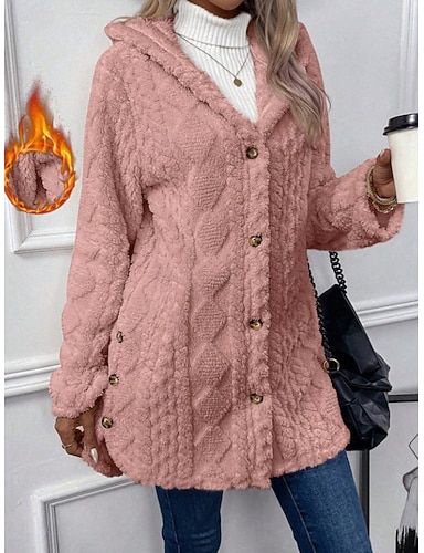 Жен. Куртка из шерпа Куртка с капюшоном Удобный Дышащий Карман Пуговицы Мода На каждый день Полотняное плетение Отпуск Для улицы Повседневные На каждый день Однобортный крой Обычная Капюшон