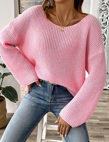 Жен. Вязаная ткань Пуловер Свитер На каждый день Мягкий Чистый цвет Рельефный узор Вырез лодочкой Трикотаж Длинный рукав Обычные топы Вязать на открытом воздухе Повседневные выходные
