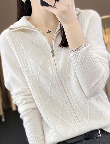 Жен. Вязаная ткань Пуловер Мода На каждый день Чистый цвет Рельефный узор Половина молния Молния Трикотаж Длинный рукав Обычные топы Вязать на открытом воздухе Повседневные выходные Белый Осень Зима
