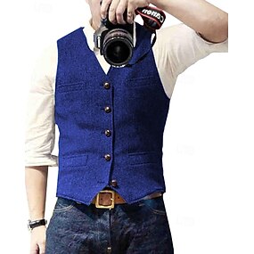 Муж. Твидовый жилет Жилет Официальные Свадьба Отпуск Повседневные Мода Классика Весна Осень Карман Пуговицы Шерсть Твид Удобный Полотняное плетение В елочку Однобортный крой V-образный вырез Лацкан product tag